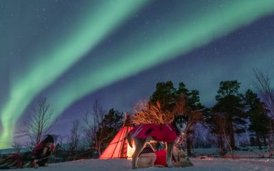 - Dog sledding into the Abisko National Park. We have lunch outdoors in a traditional lavvu (tipi tent) and make coffee / tea over an open fire.